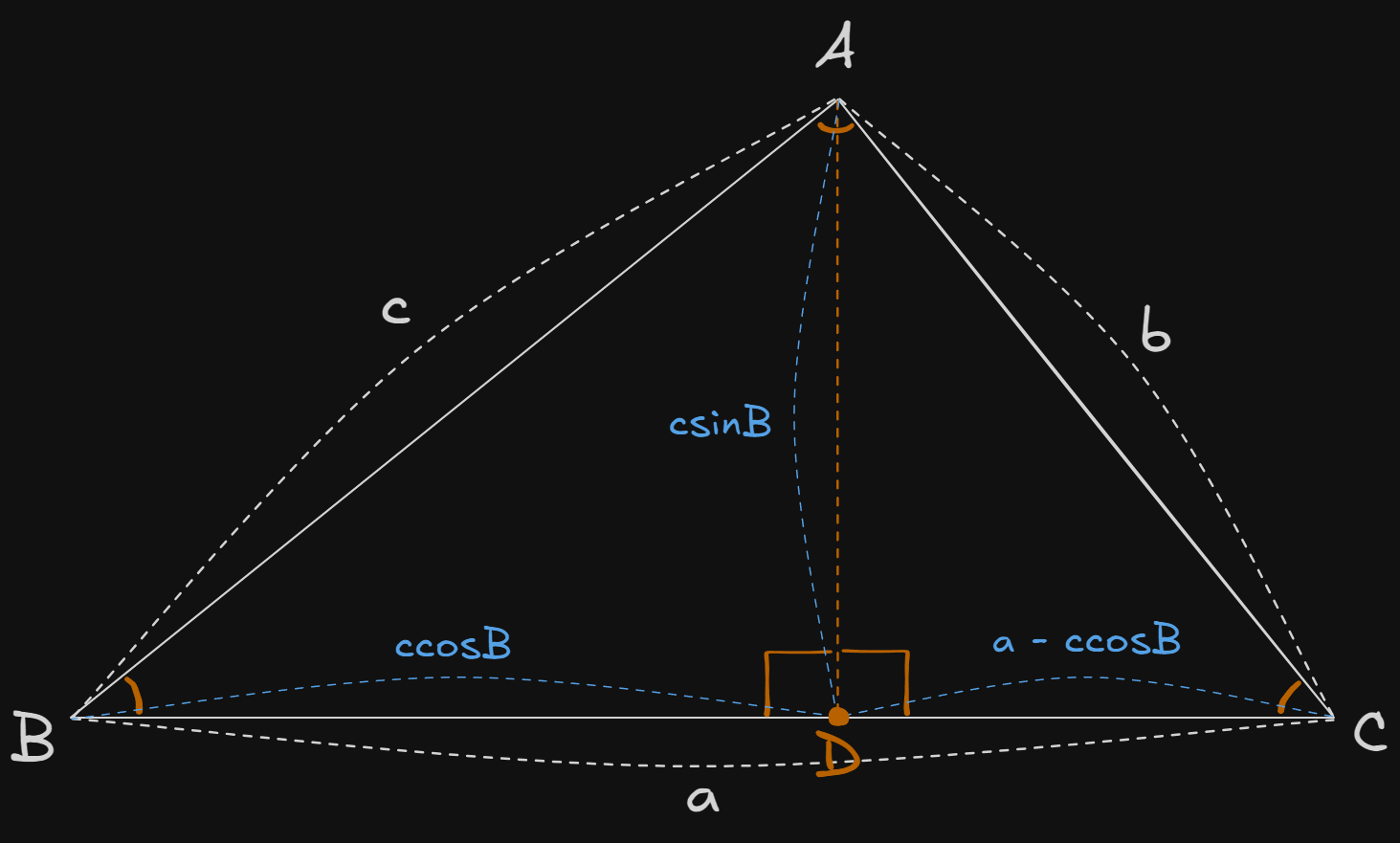 - 이때 $\overline{BD} = c\cos{B}$, $\overline{AD} = c\sin{B}$이다.