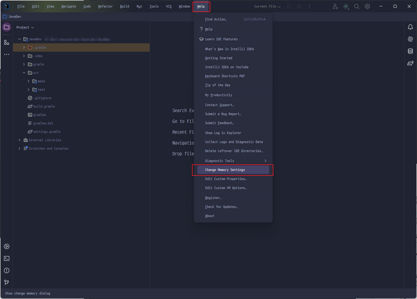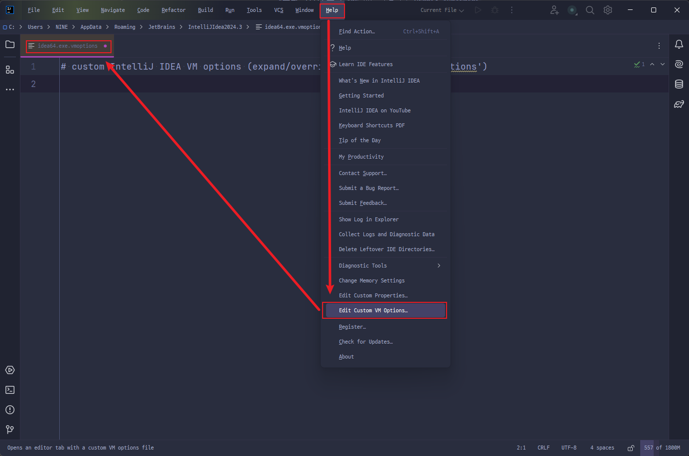 Help > Edit Custom VM Options 선택,