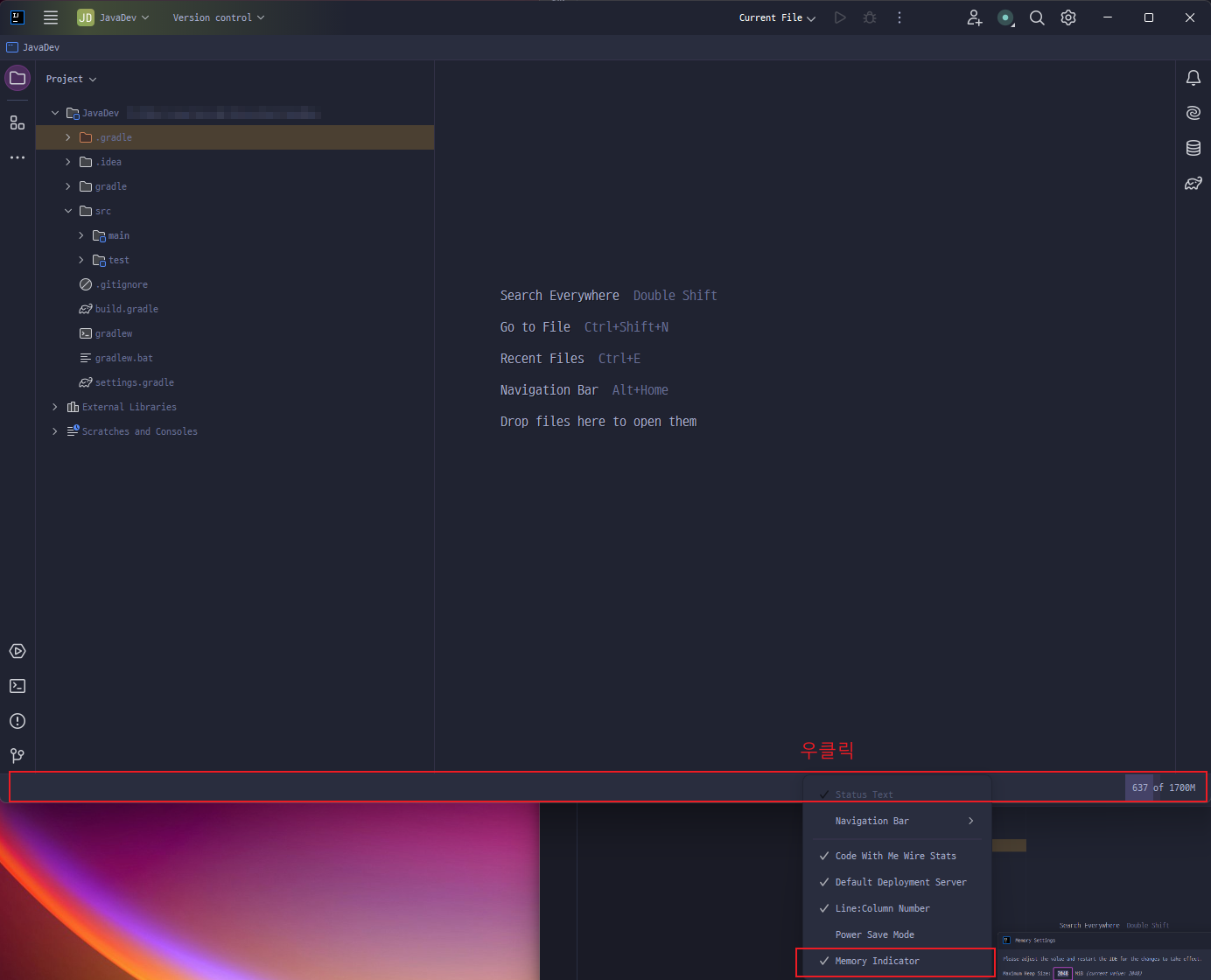 IDE 하단 우클릭 > Memory Indicator