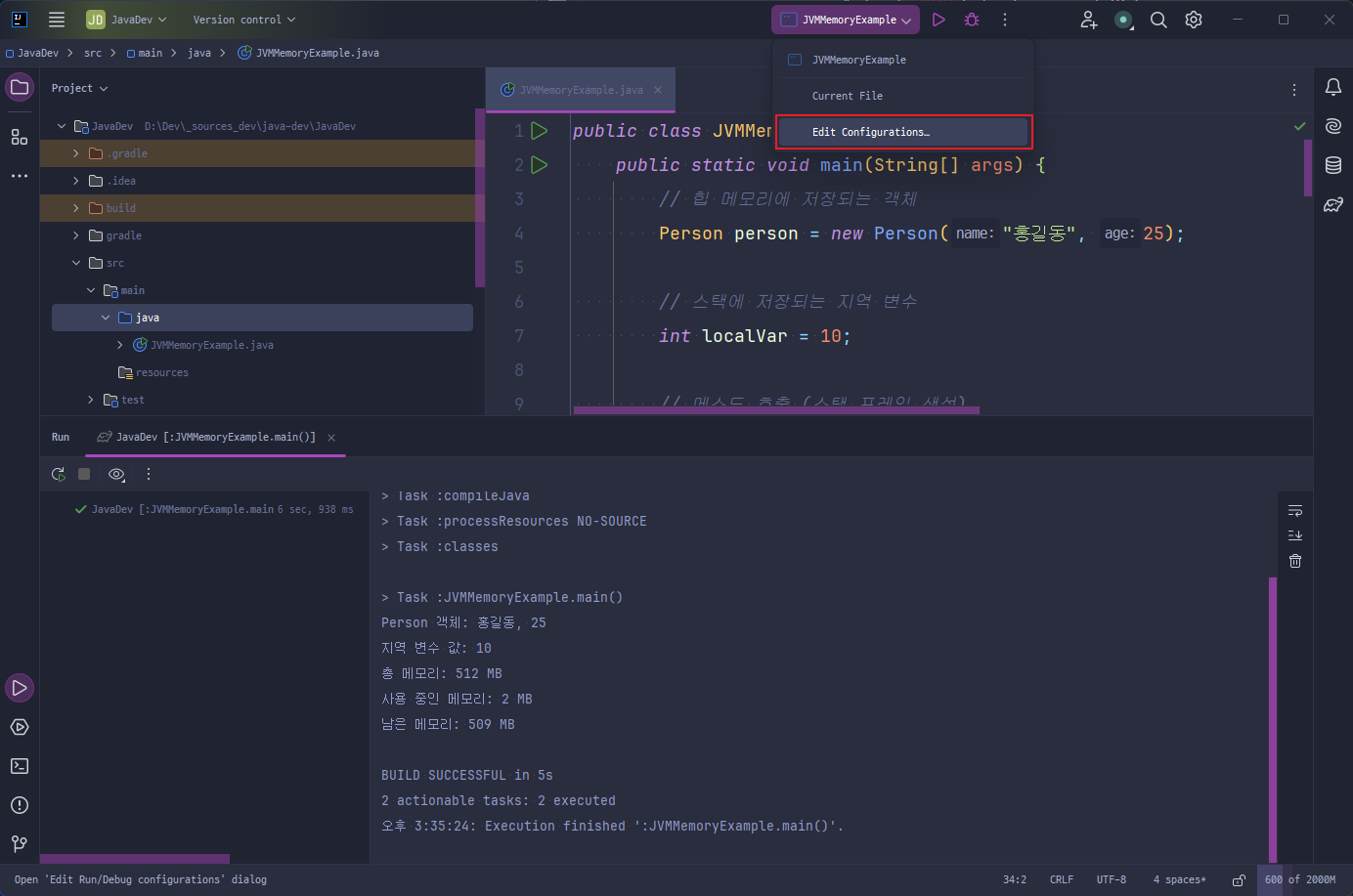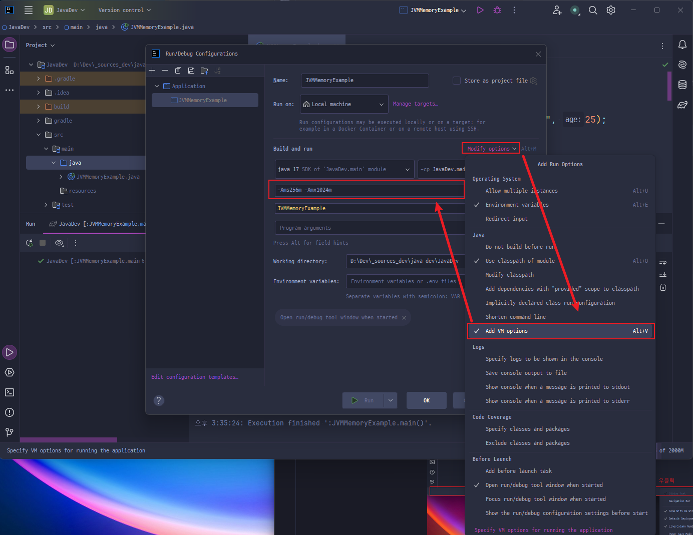 Run/Debug Configurations에서 VM Options 설정으로 특정 프로젝트의 애플리케이션을 실행할 때 사용되는 JVM의 메모리를 설정할 수 있다.