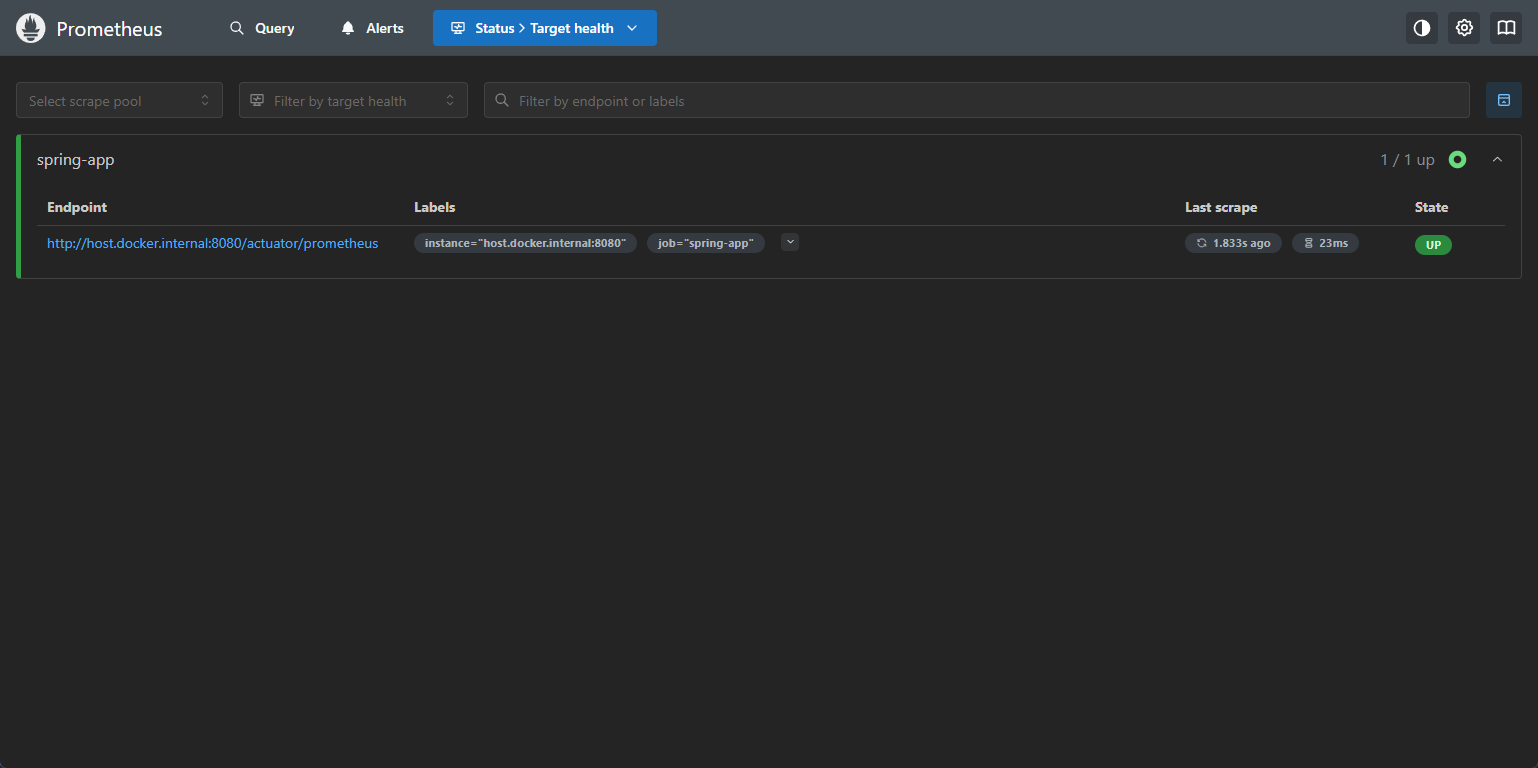 - targets : [ 'host.docker.internal:8080' ] # 타겟 주소 (로컬 Spring Boot 앱)