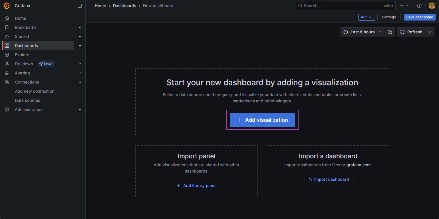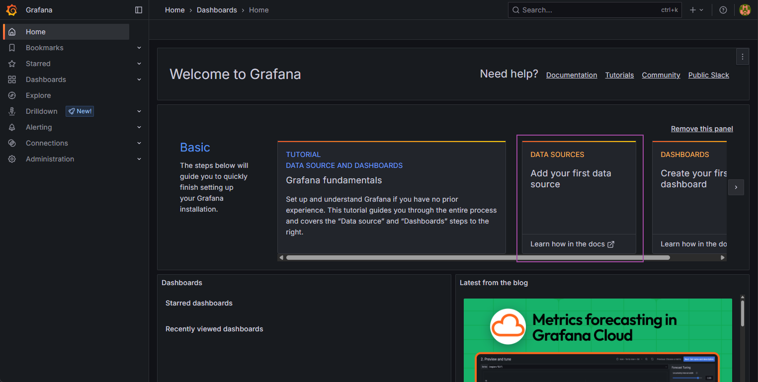 Grafana UI 설정해둔 주소 localhost:3000 접속 후 별다른 설정을 하지 않았다면 기본 로그인 정보인 (id: admin, pw: admin)으로 로그인한다.