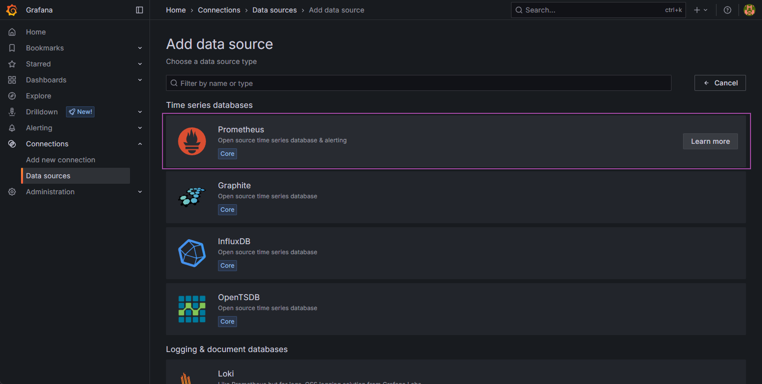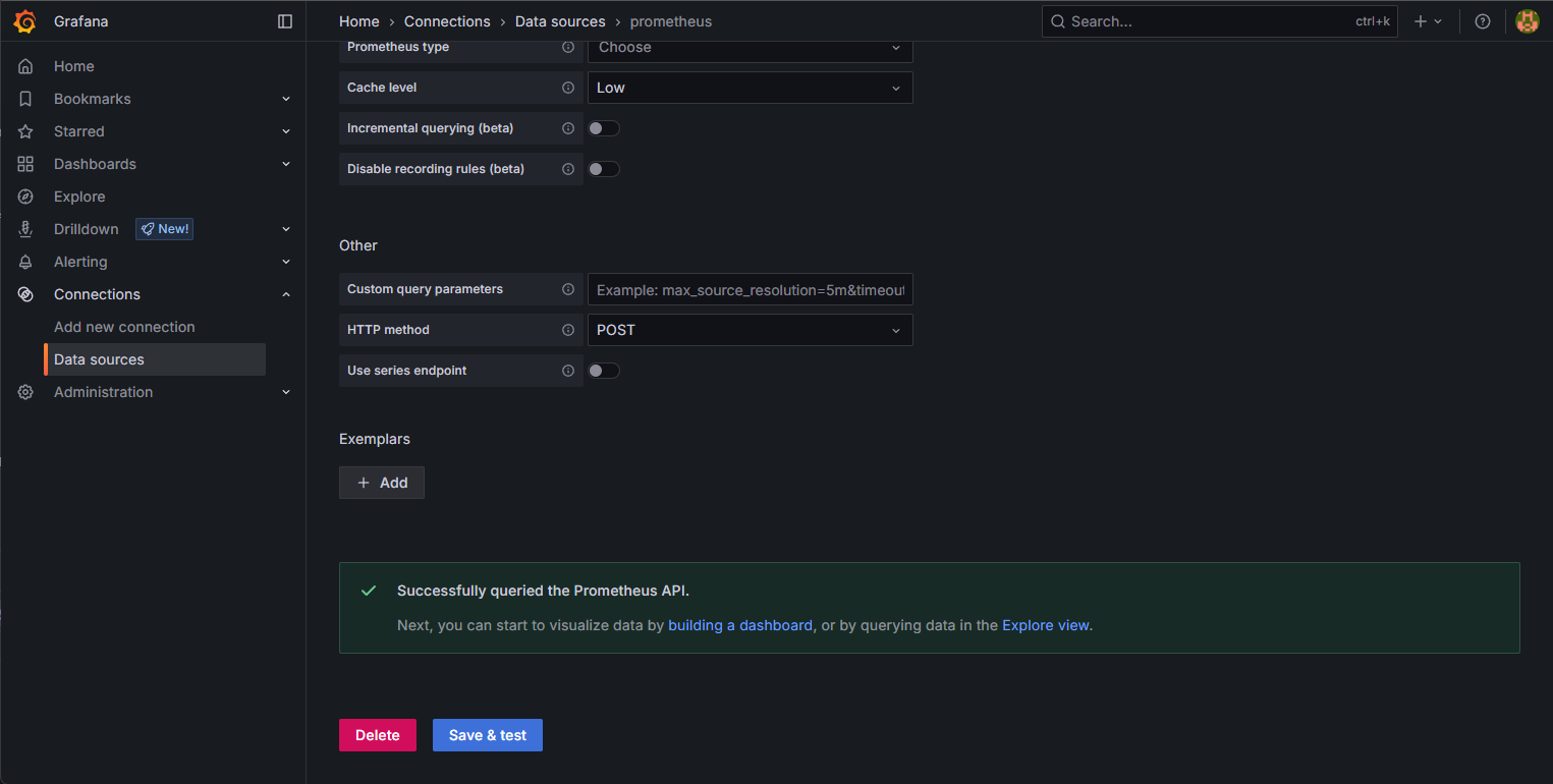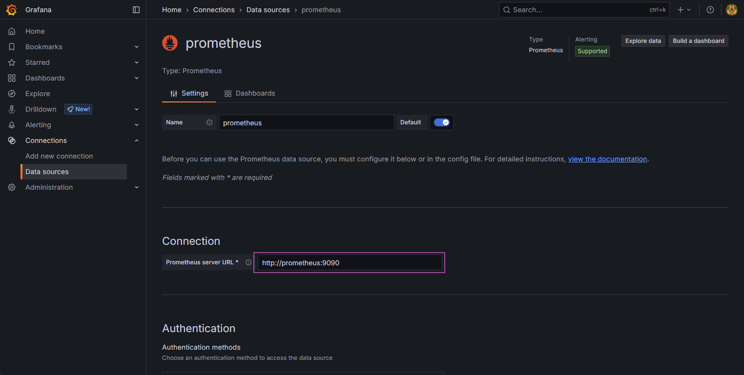 주의할 것은 localhost 아니고 docker-compose.yml에서 설정한 컨테이너 이름이자 내부 DNS를 prometheus로 사용